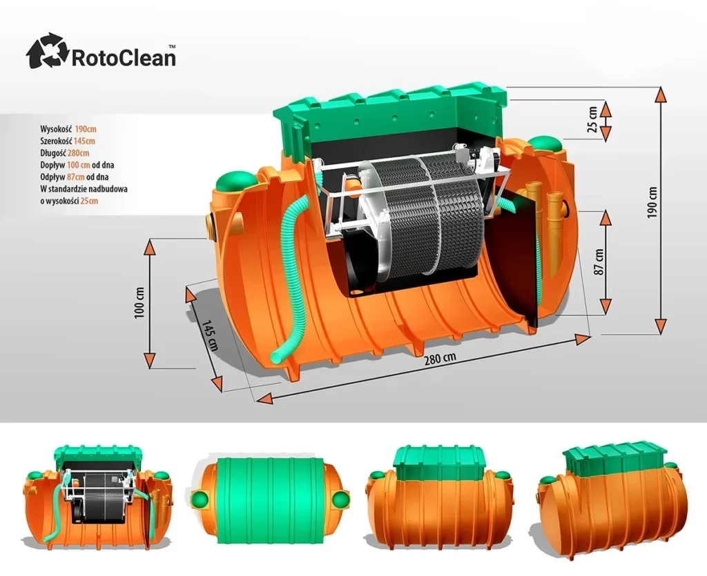 Przydomowa biologiczna oczyszczalnia ścieków RotoClean to innowacyjna oczyszczalnia w technologii biologicznych złóż obrotowych. Idealna do montażu w miejscach pozbawionych dostępu do kanalizacji sanitarnej. Unikalna konstrukcja i płytako osadzony dopływ urządzeń na montażu w każdych warunkach gruntowo-wodnych. Urządzenie RotoClean składa się z poziomego, wzmocnionego zbiornika podzielonego na osadnik wstępny, biologiczny oraz wydzieloną komorę osadnika zarejestrowanego. Oczyszczalnia jest na zasilaniu, wahania temperatury i chwilowy brak dopływu ścieków. Za nadanie ruchu obrotowego złoża uniwersalnego ze sterowaniem dozownikiem odpowiada wolnoobrotowy motoreduktor.